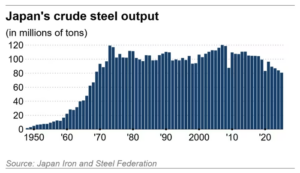 Japan’s steel export industry is facing pressure from multiple sides. According to data from the Japan Iron and Steel Federation (JISF), Japan’s crude steel production in 2025 fell 4% to 80.67 million tons, the lowest level since 1969. This allowed the United States to surpass Japan in steel production for the first time since 1999, to take second place. This decline is due to project delays caused by labour shortages, impacting demand from the construction industry, and a prolonged slump in domestic new car sales, contributing to reduced steel demand. While China remains a significant factor, the influx of cheap imports has pushed domestic steel prices to record lows and crude steel production has plummeted.